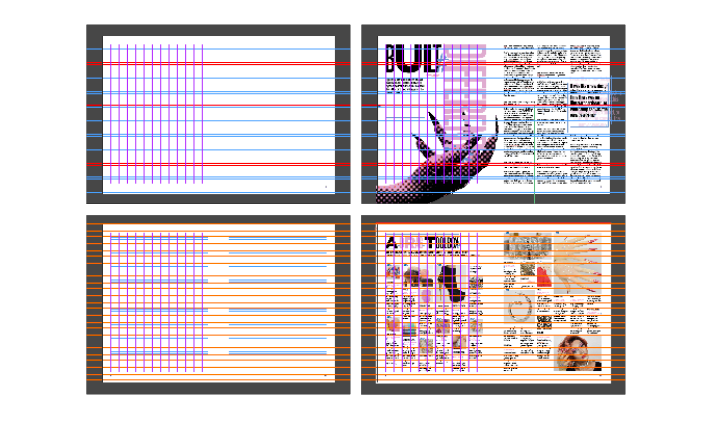 I decided on a 12-column-grid as it alowed for a good balance between freedom and structure and enabled me to vary the widths of my columns depending on the content of the specific article. The use of an eight-row image-grid was loose as I was very fluid with my imagery and very rarely used an image with a straight rectangular border. This felt apt for the content of the magazine, it is all about not fitting inside a box and breaking boundaries.