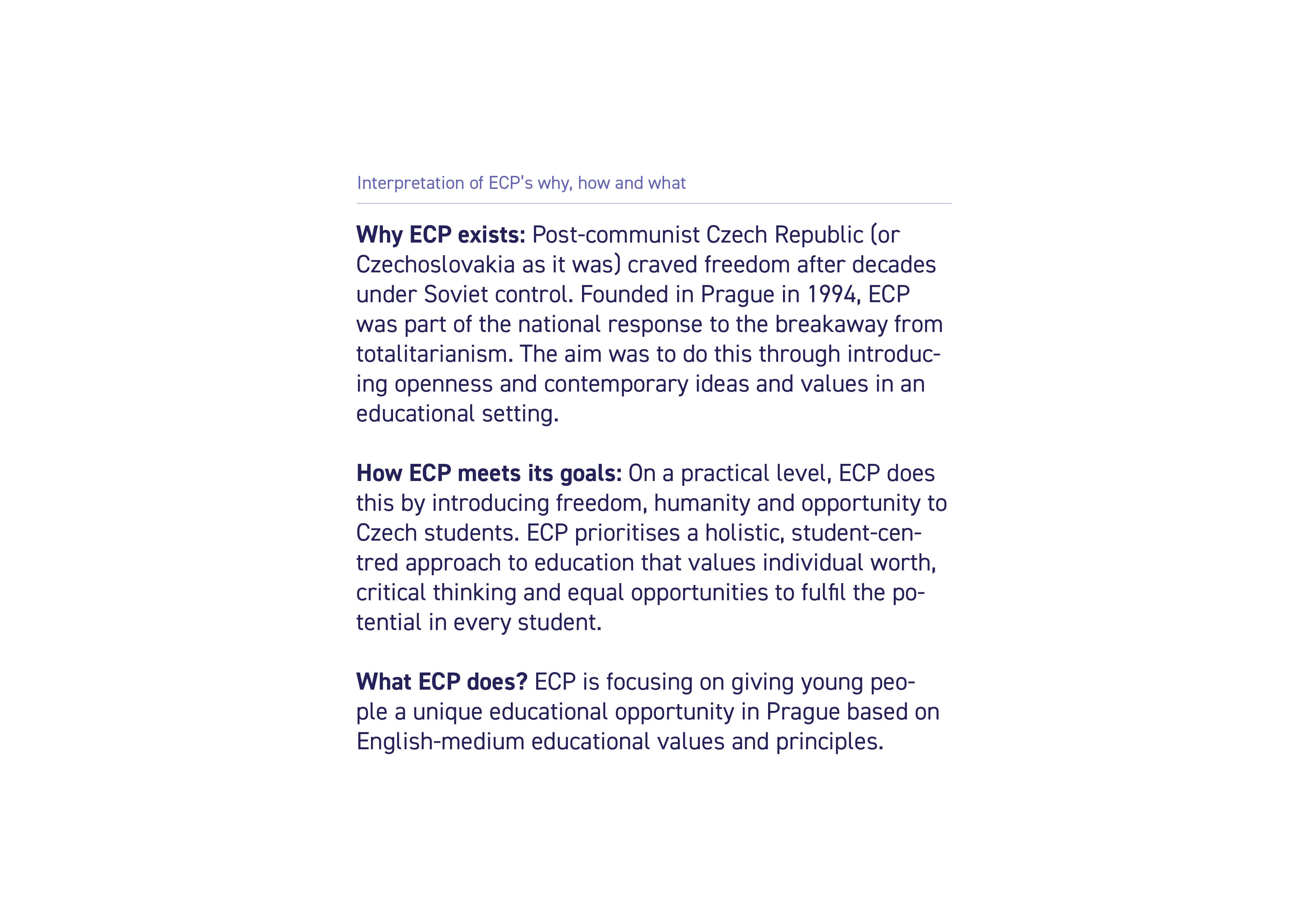 In order to understand ECP as a whole we needed to delve into the why, what and how to gain context behind the school. This steered us in the right direction to begin our research phase.