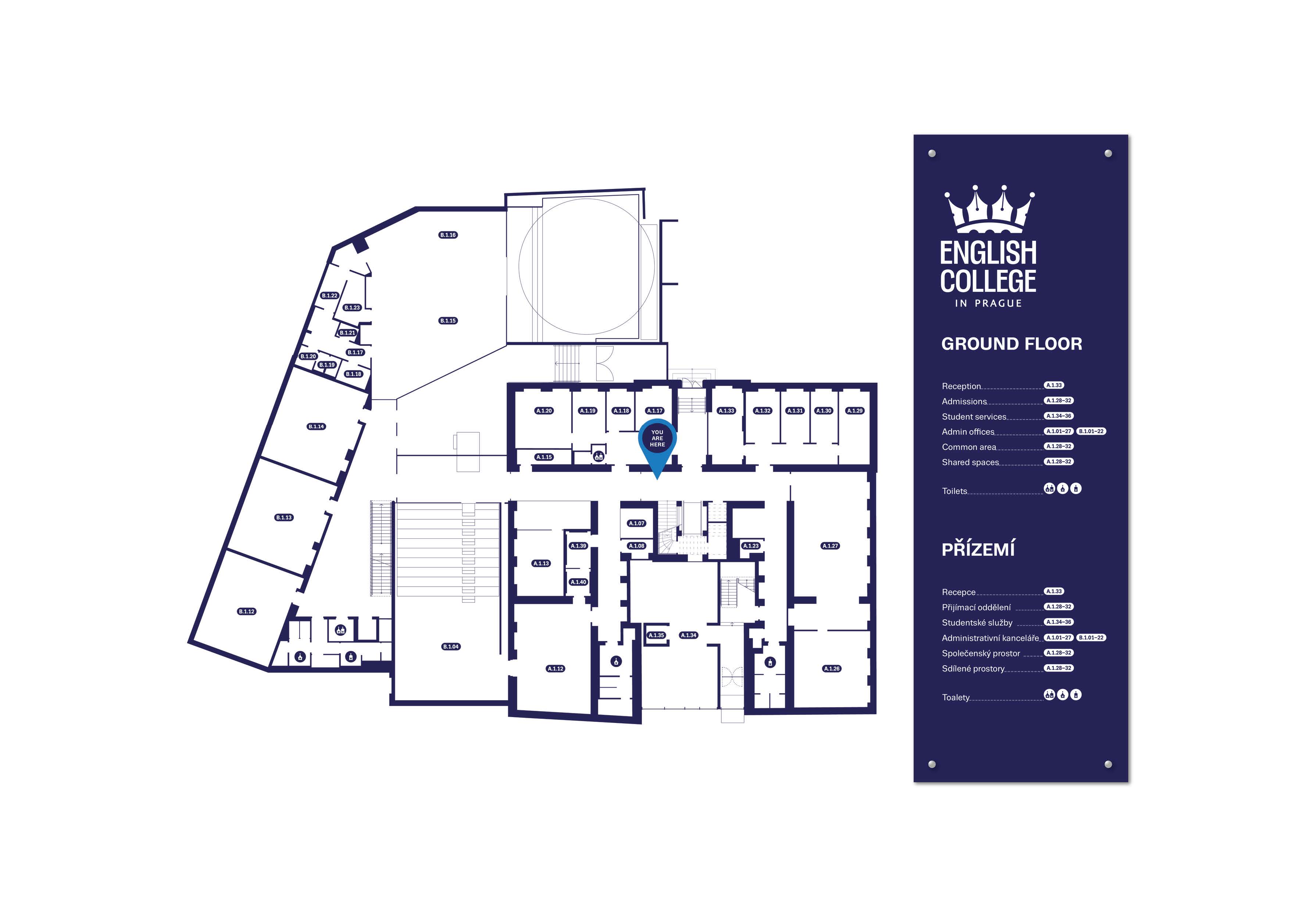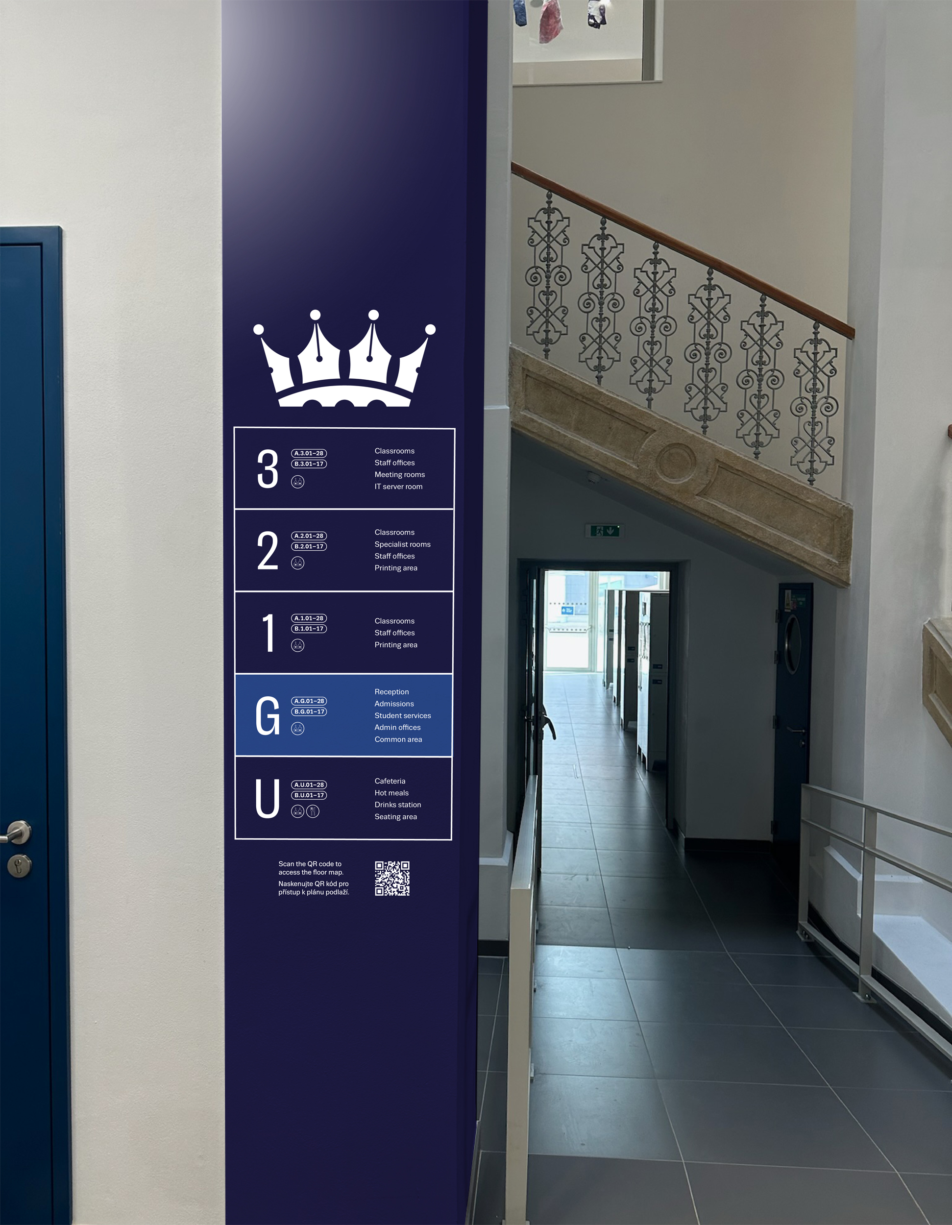 External signage is the first touchpoint of the brand linked to the building, ensuring visibility and recognition from a distance. The application shown incorporates both English and Czech, reinforcing the school’s international outlook while ensuring accessibility and inclusivity for all audiences.