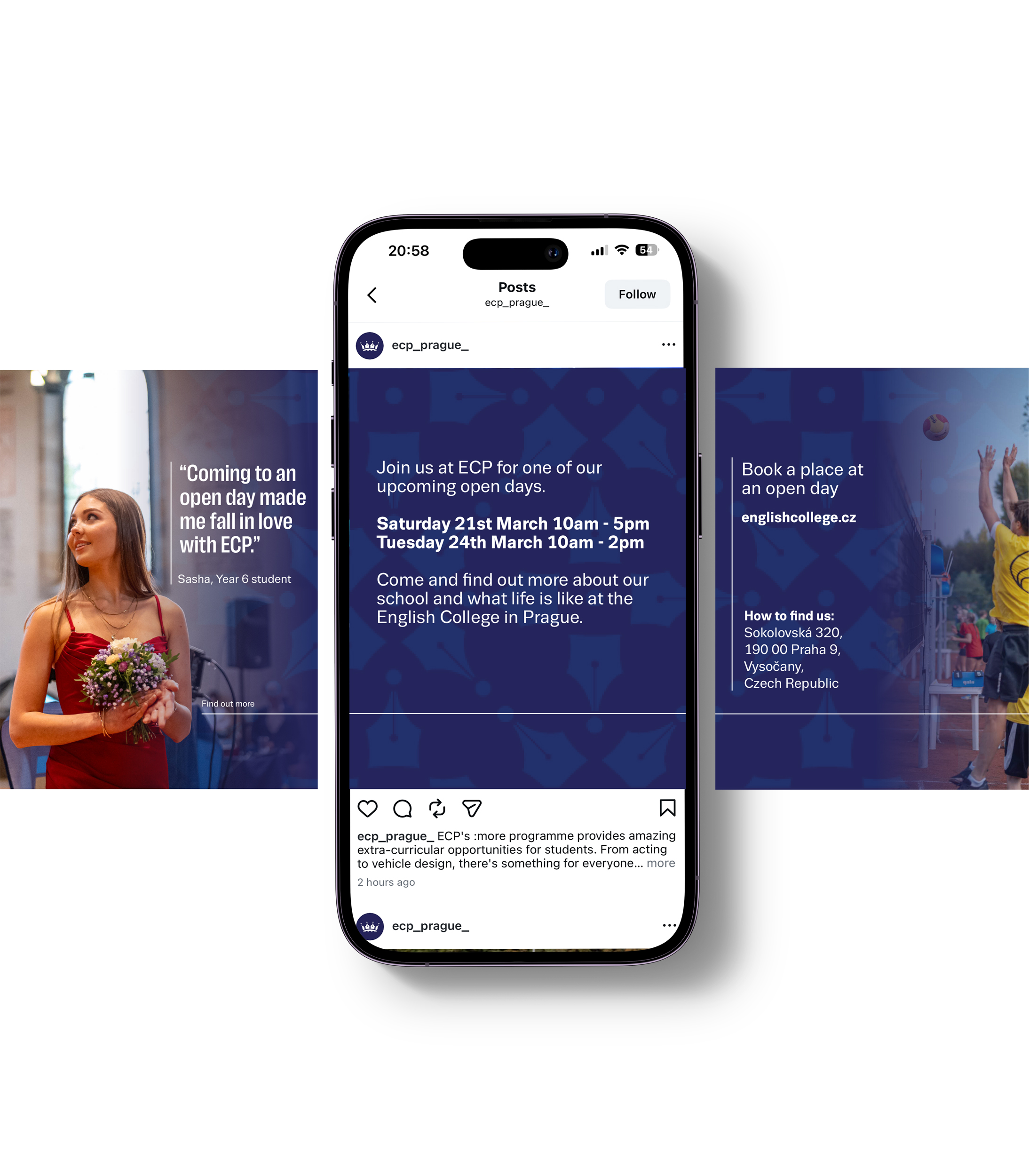 This is a proposal for a carousel post designed to promote events such as open days. The use of gradients, paired with a low-opacity background pattern, can be applied using ECP navy alongside the wider brand colour palette. This example highlights student voice through the inclusion of quotes, addressing a key finding from the user research that student voice was previously underrepresented.